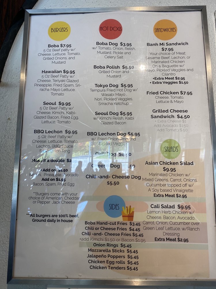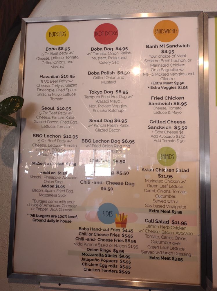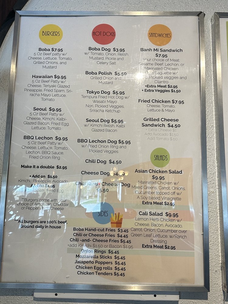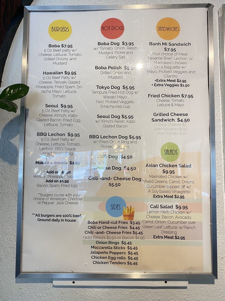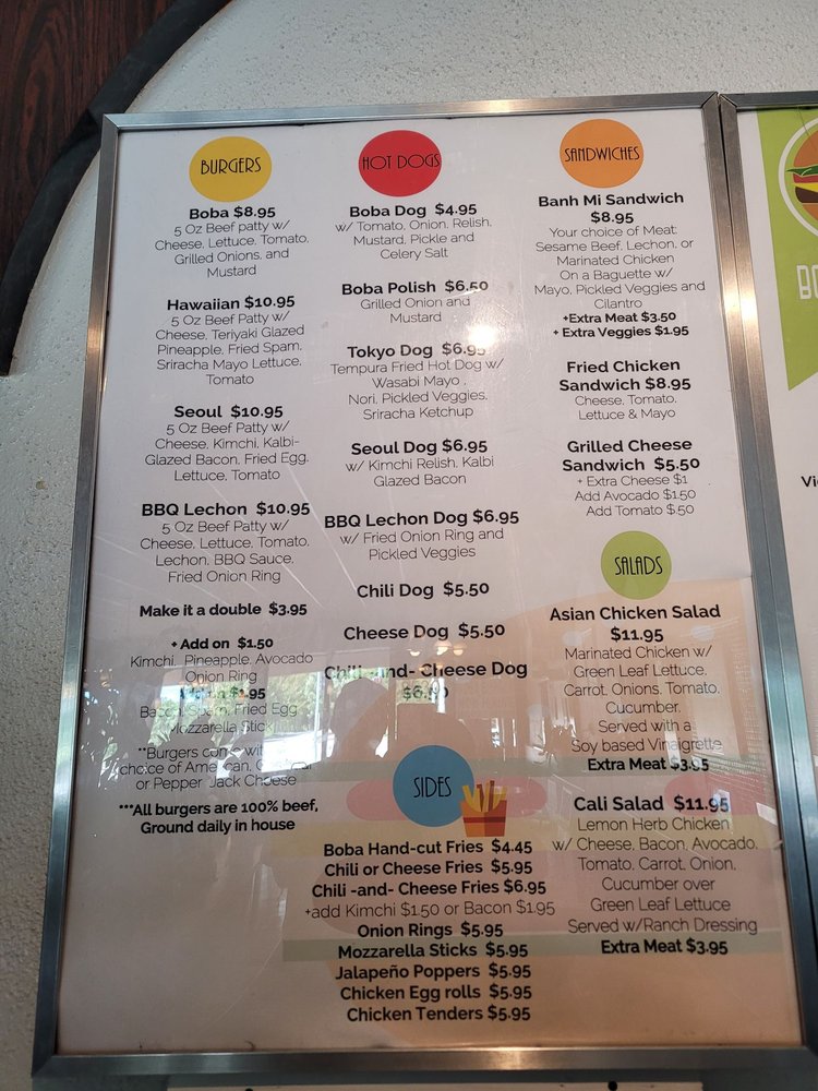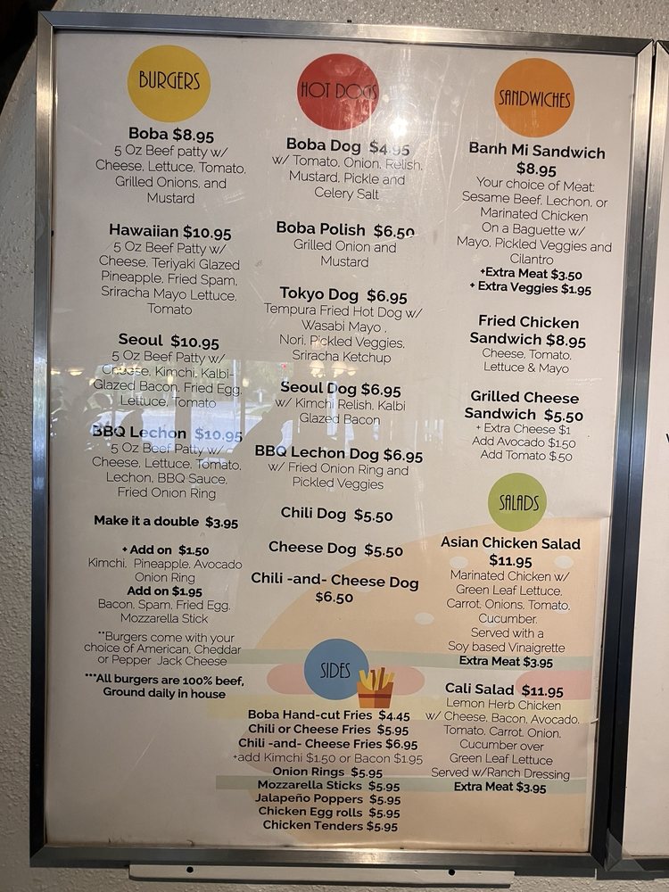 Introducing the menu at Boba Burger, located in Morton Grove, IL, offers a unique fusion of Asian-inspired burgers and hot dogs. Customers rave about the Seoul Burger with kimchi and kalbi flavored bacon, as well as the BBQ Lechon Burger with crispy fried pork and onion rings. The menu also includes innovative creations like the Tokyo Dog and the Hawaiian Burger, all priced affordably under $10. Boba Burger is housed inside Classic Bowl, a retro bowling alley, adding to its quirky charm. With quick service, diverse menu options, and a friendly atmosphere, Boba Burger is a hidden gem worth discovering for burger lovers seeking a twist on traditional favorites.